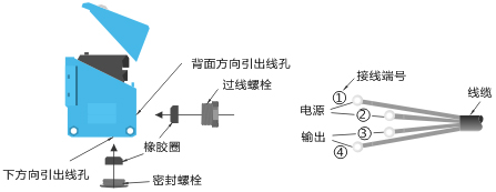 | ⑴ 根据安装条件选择使用背面方向出线方式 或下方向出线方式 ⑵ 按照右图所示连接端号接线 ⑶ 不使用引出线孔的时候装上密封螺栓 ⑷ 右图所示为背面方向出线方式 |